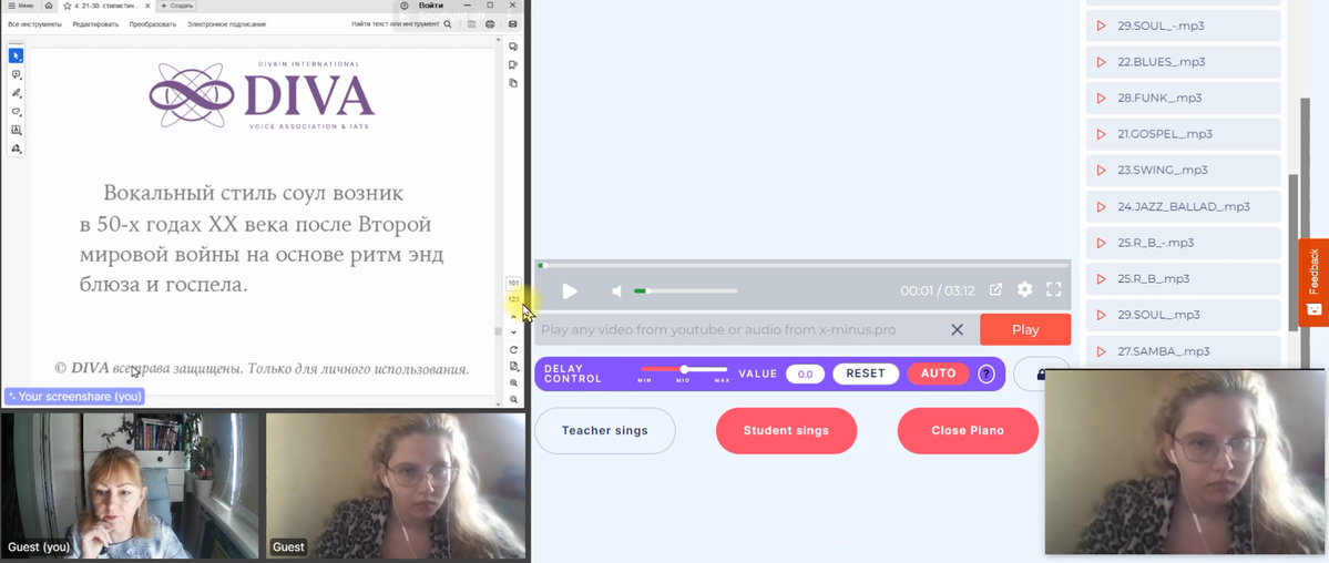 - Используйте в работе с учениками 60 уникальных вокально-стилистических упражнений DIVA начального, среднего и продвинутого уровня, в формате mp3+, mp3 — и ноты к ним в PDF формате.