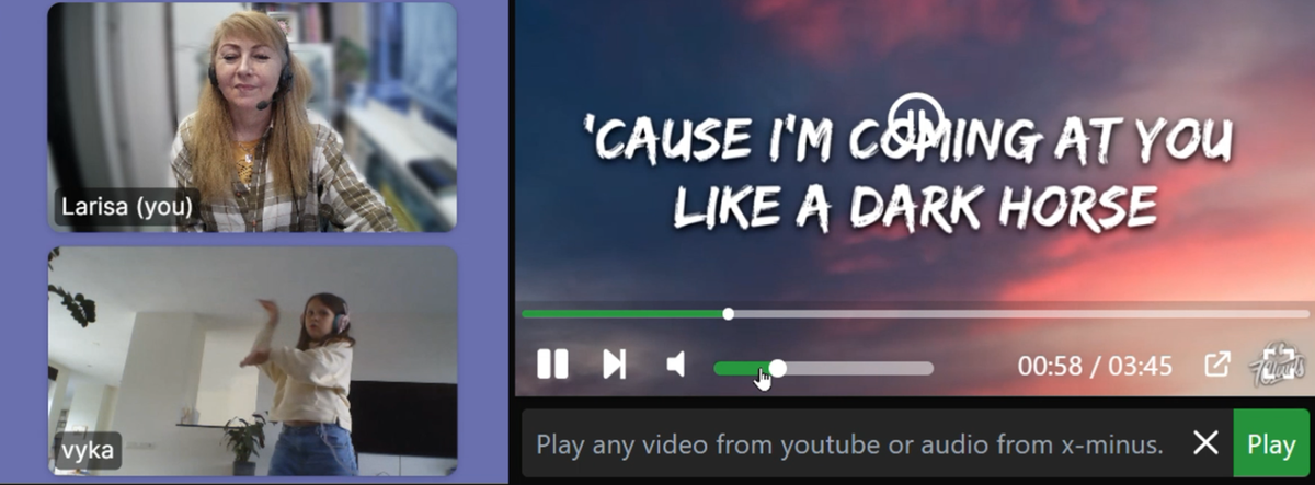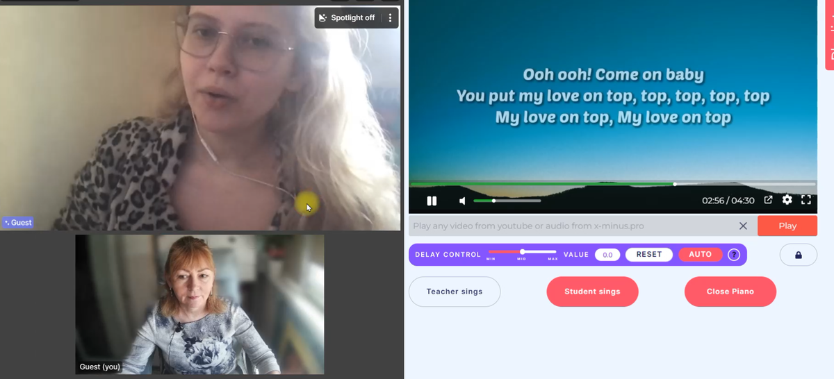 - Меняйте по желанию размер окон программы или видео плеера, например: сделайте его на весь экран при исполнении караоке с youtube.com, при этом внизу экрана автоматически появится еще одно окошко с вашим учеником, так что вы будете всегда его видеть. То же может сделать и ваш студент.